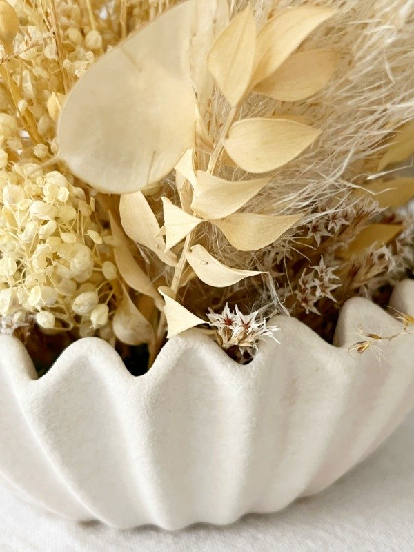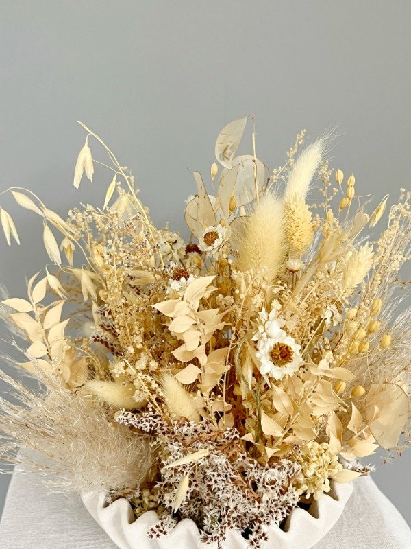 Componentes principales: estrellita, amobium, pampas delicadas, lunaria, alpiste y colitas de visón, complementados con avena para un acabado ligero y etéreo.